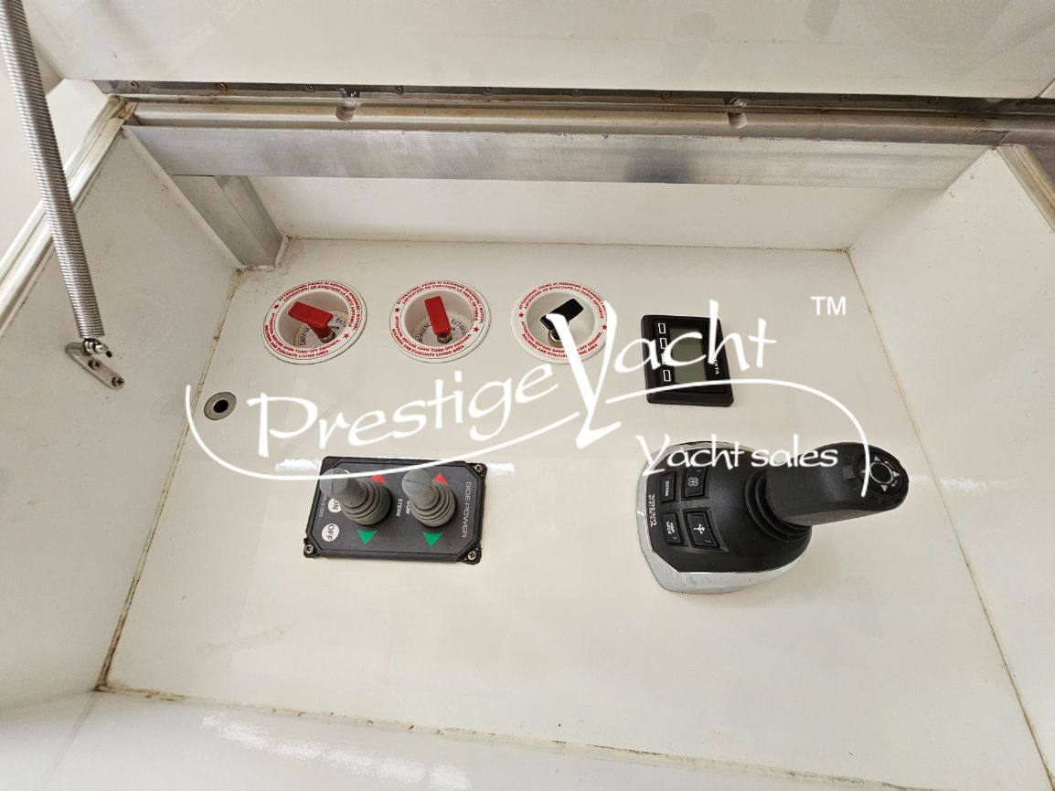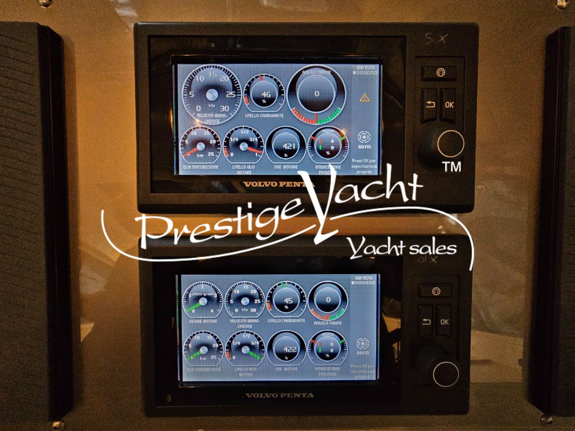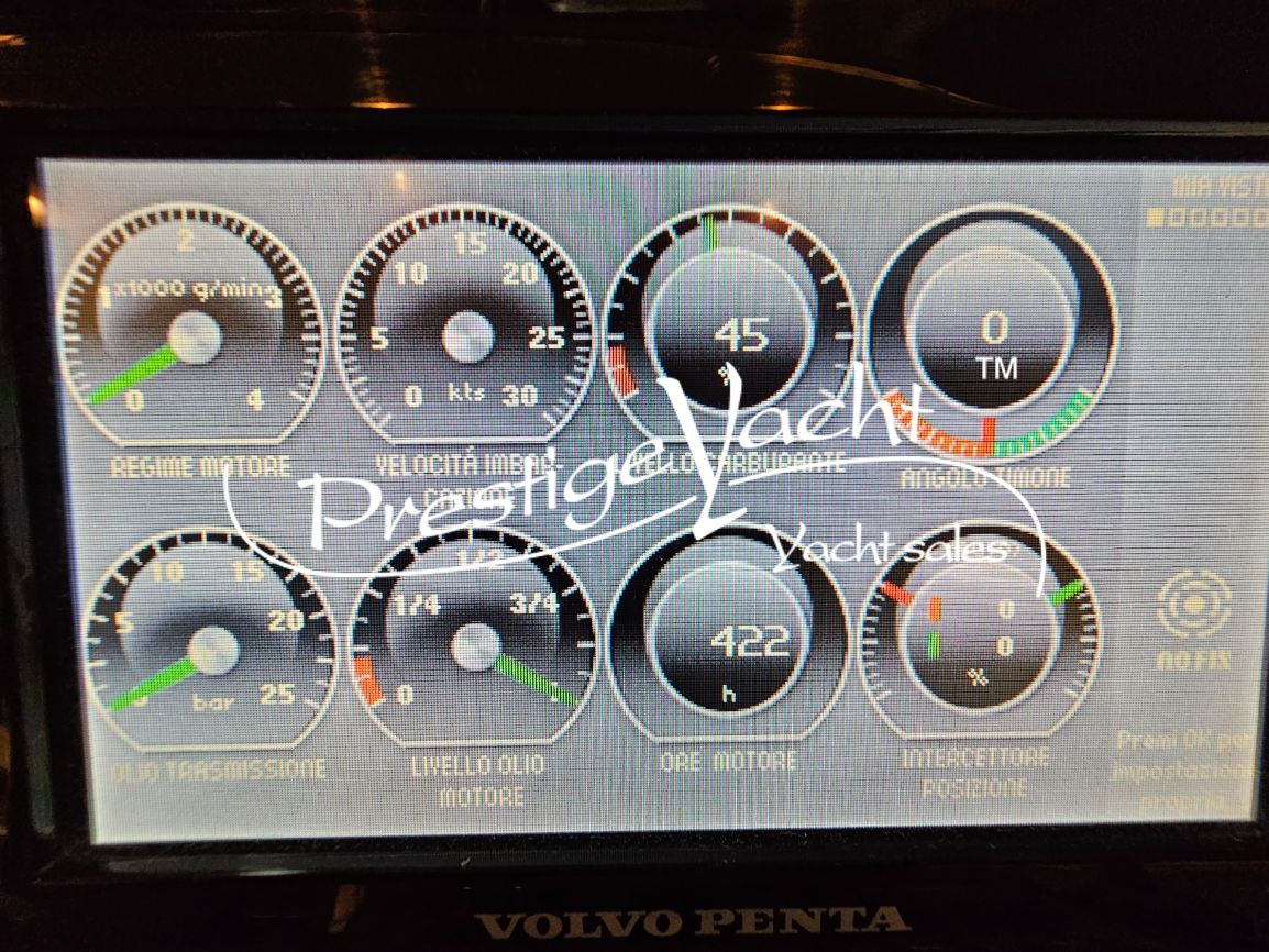 | AIS, Angolo barra, Antenna radar, Bussola, Comando motori elettronico, Computer di bordo, Contametri catena, DSC vhf, Ecoscandaglio, GPS, Interfaccia, Joystick, Pilota automatico, 2 Plotter (Raymarine), Radar, Radio VHF