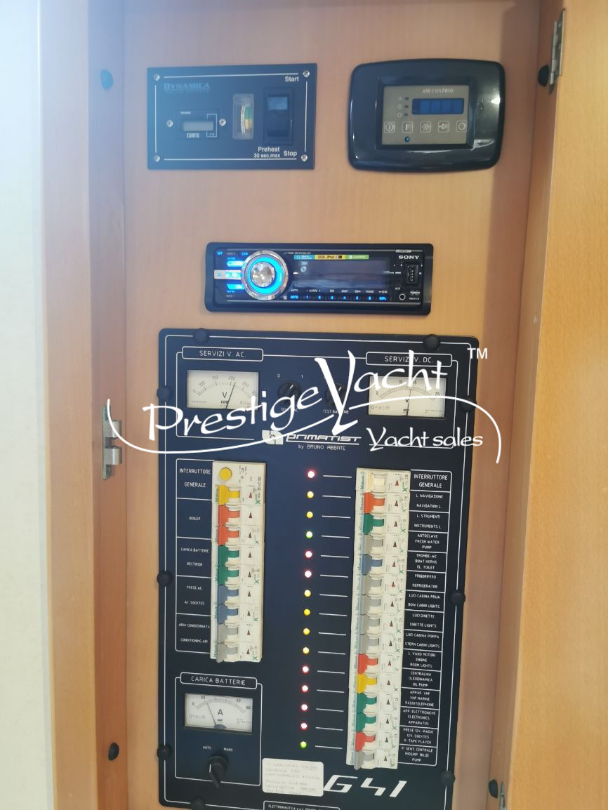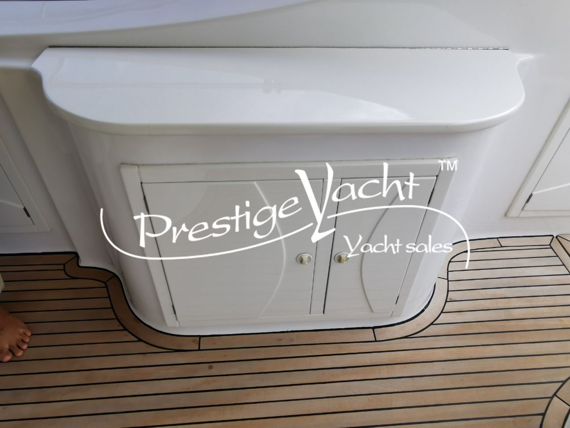 | Allarme motore, Ancora, Autoclave, Caricabatterie, Doccia esterna, Elica di prua, Faro orientabile, Flap idraulici, Hard Top, Impianto antincendio, Indicatori flaps, Luci di cortesia, 1 Passerella (idraulica a scomparsa), Piattaforma, 3 Pompa di sentina automatica, Pompa di sentina manuale, Porta di ingresso, Pozzetto in teak, Salpa ancora elettrico, Scaletta da bagno, Tavolo in pozzetto